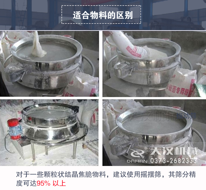搖擺篩由于采用了仿人工篩分和加設(shè)了清網(wǎng)裝置,所以更加適合500目?jī)?nèi)不規(guī)則或潮濕的物料,克服了普通振動(dòng)篩的堵網(wǎng)風(fēng)險(xiǎn),而振動(dòng)篩屬于非平衡破壞暴力運(yùn)動(dòng),利用了振動(dòng)原理來(lái)篩分物料,所以有時(shí)還會(huì)破壞物料,所以對(duì)于一些顆粒狀結(jié)晶焦脆物料,建議使用搖擺篩,其篩分精度可達(dá)95% 以上。