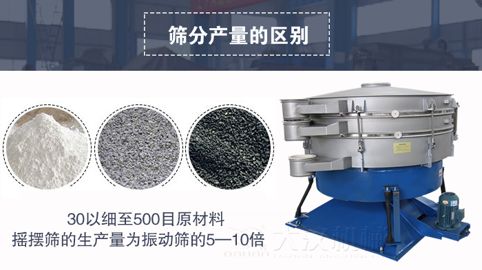針對(duì)30目以粗上物料而言,振動(dòng)篩和搖擺篩產(chǎn)量基本相同,對(duì)30以細(xì)至500目原材料來(lái)說(shuō),搖擺篩的生產(chǎn)量則大大高過(guò)振動(dòng)篩,一般為振動(dòng)篩的5—10倍。