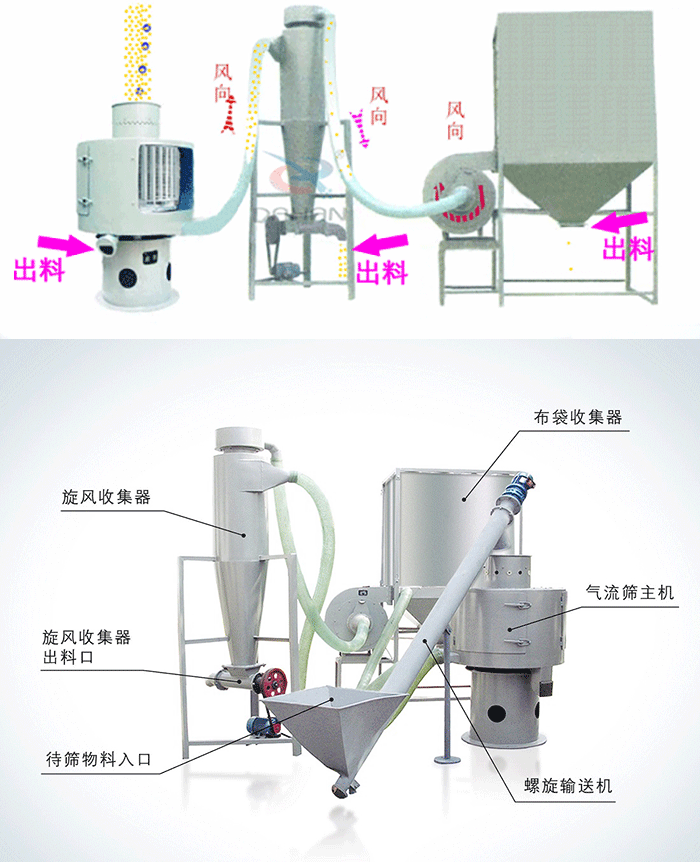 氣流篩分機(jī)擯棄重力勢(shì)能作業(yè)原理,采用空氣作載體,動(dòng)能作功的作業(yè)原理。通過(guò)負(fù)壓氣流將物料與空氣混合后,進(jìn)入篩機(jī)風(fēng)輪中間,通過(guò)風(fēng)輪葉片施加足夠的離心力,向桶型篩網(wǎng)噴射過(guò)網(wǎng),經(jīng)過(guò)蝸殼收集。超徑物料不能過(guò)網(wǎng),由自動(dòng)排渣口排出,從而達(dá)到快速篩分之目的。